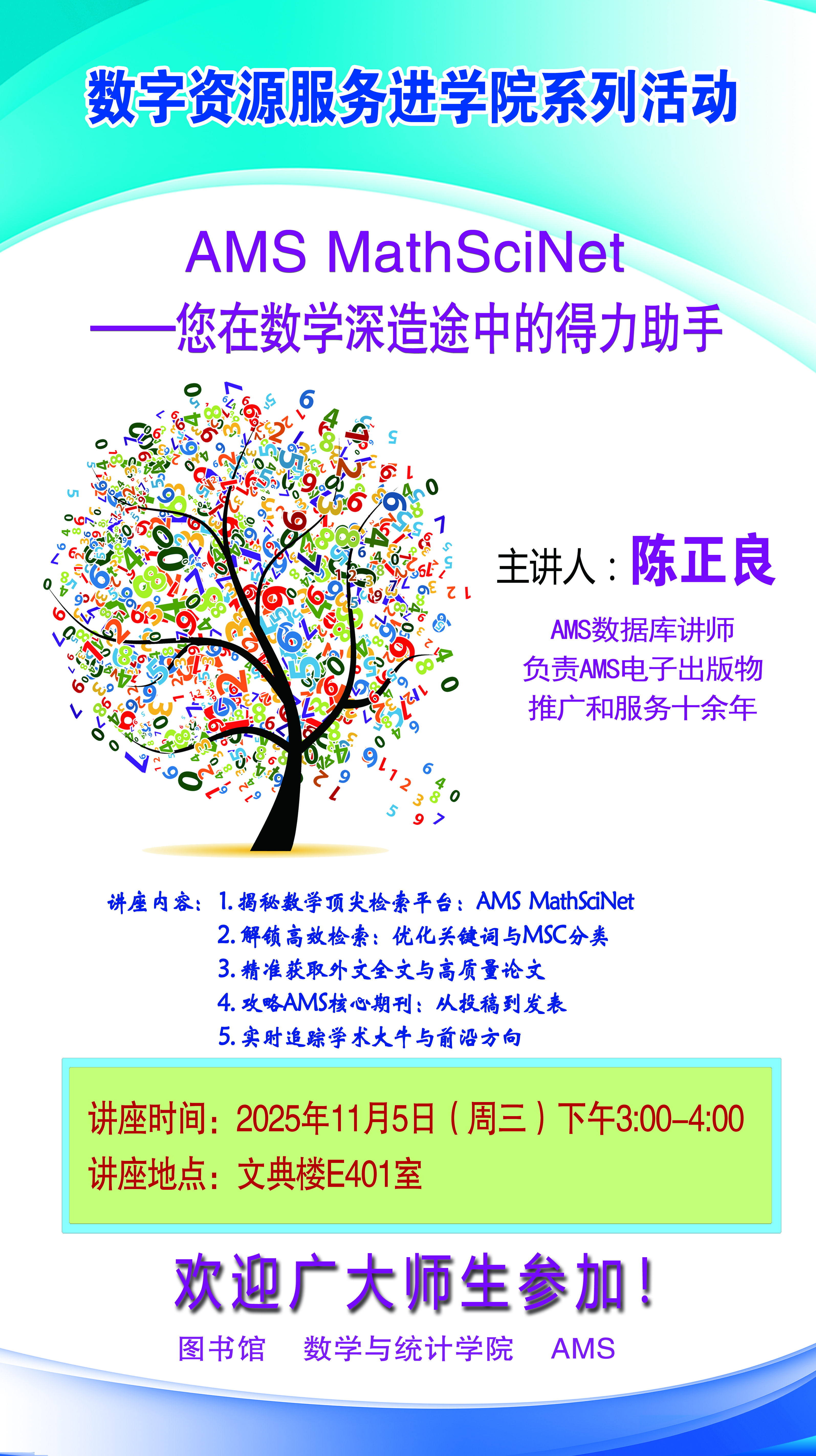 美国数学学会(American Mathematical Society,简称AMS)创建于1888年,多年来一直致力于促进全球数学研究的发展及其应用,也为数学教育服务。AMS出版物包括:多种专业电子期刊、电子图书以及数学评论(Mathematical Reviews)。目前收录内容达到190万条记录,并以每年7.4万条的速度增长,提供36万条链接,指引用户查看550种期刊原始文献,是检索世界领域数学文献的重要工具。