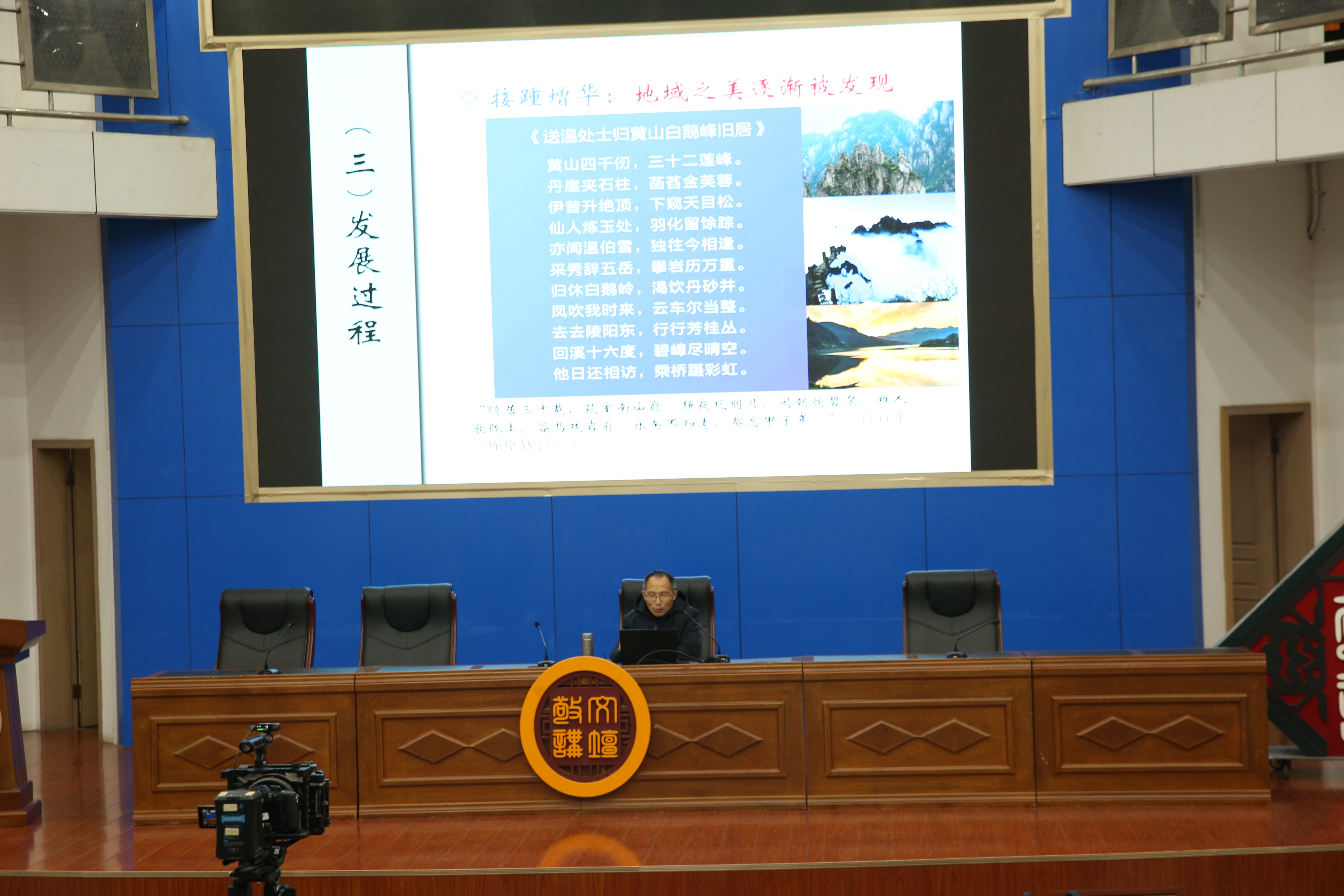 本网讯(文/张千帆 图/刘雅洁)诗路寻踪探皖韵,山水融情润心田。11月26日晚6时30分,敬文讲坛2025年第七讲(总第161讲)在敬文图书馆国际学术交流中心顺利举行。安徽师范大学中国诗学研究中心研究员韩震军应邀做了题为“山水有真意 相看两不厌:灵动的皖南诗路”的学术讲座。本次讲座由图书馆与渡江战役纪念馆(安徽名人馆)管理处联合主办,校图书馆副馆长刘和文主持,全校四百余名师生现场聆听。