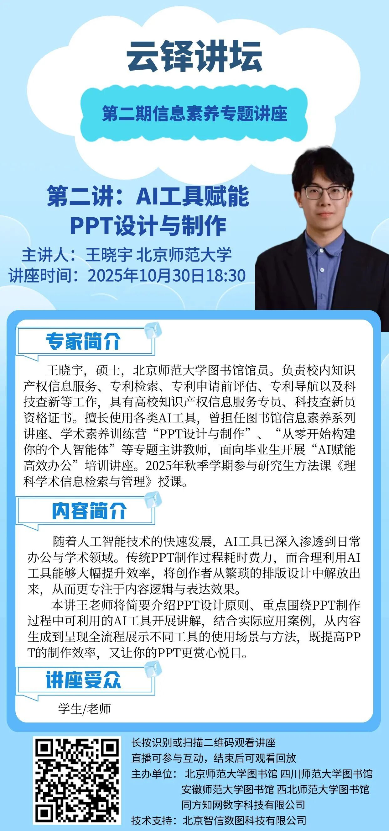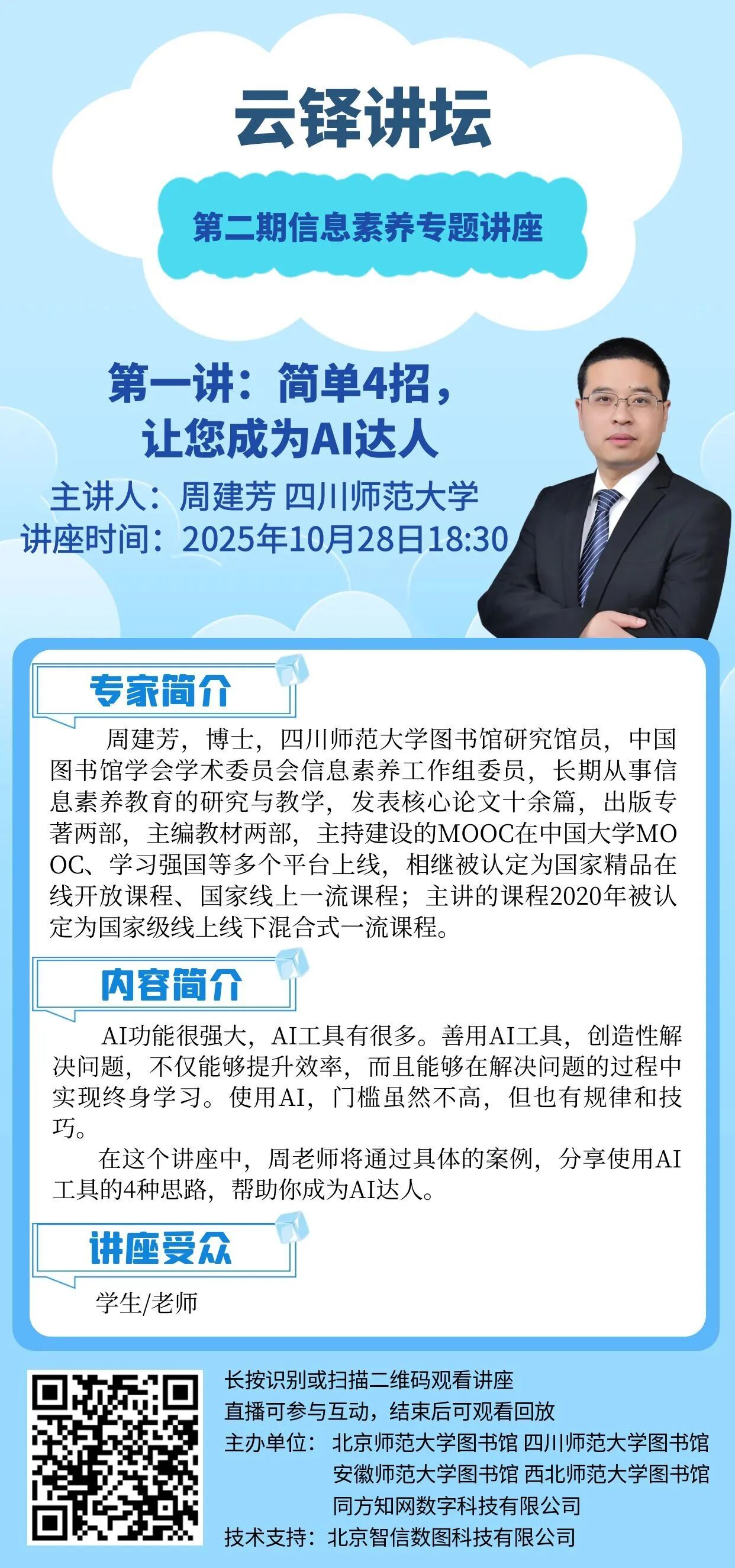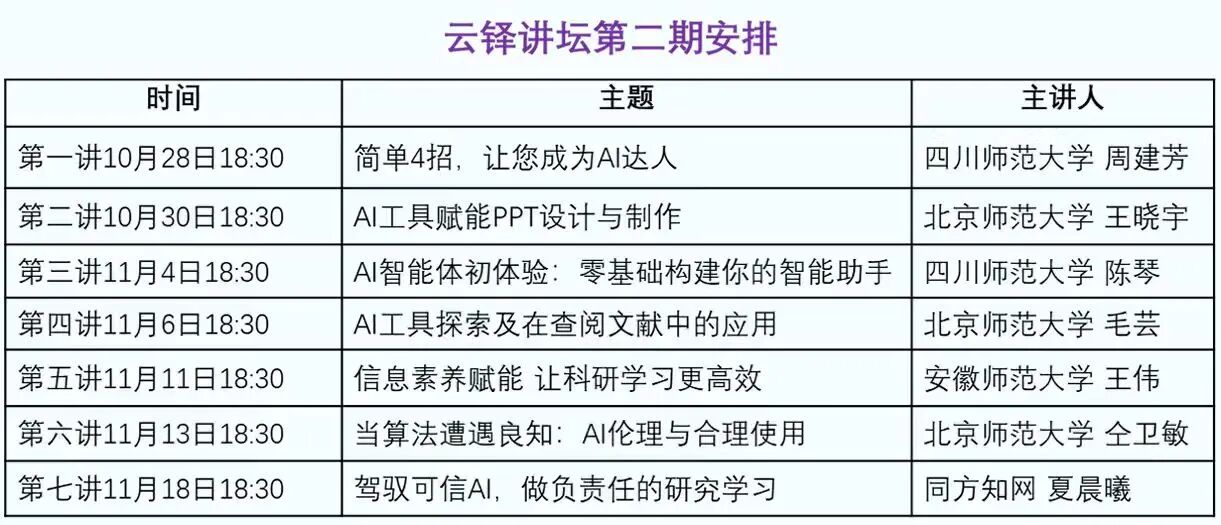 2025年6月,北京师范大学图书馆联合四川师范大学图书馆成功举办了云铎讲坛第一期线上讲座,4场讲座累计参与超过6500人次,初见成效。本学期,我们进一步拓展培训主题、扩大主讲教师队伍,具体安排如下: